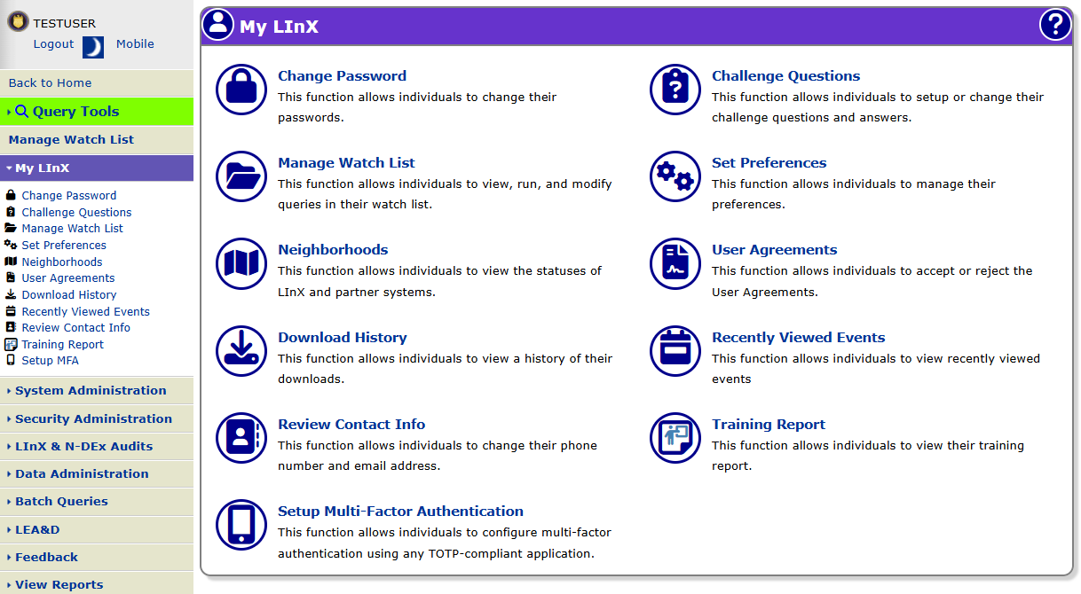 Tactical and Analytical LInX users can access My LInX from the menu bar located on the left side of the screen. The user will automatically be taken to the My LInX screen. The options available from the My LInX screen will be dependent on the user’s privileges. The options include: