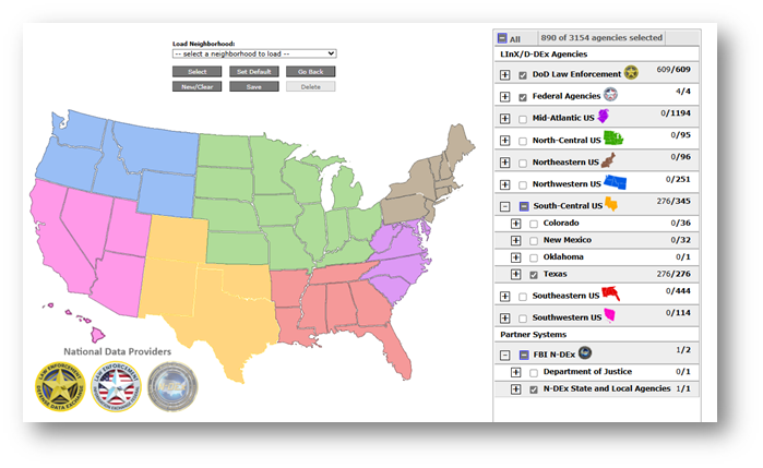 When selecting N-DEx State and Local Agencies, the list of LInX/D-DEx selected states to search will be passed to N-DEx as an exclusive filter. In the figure below, the state of Texas is selected, and N-DEx State and Local Agencies is selected. Searching with that neighborhood will limit results to agencies from Texas for both LInX and N-DEx.