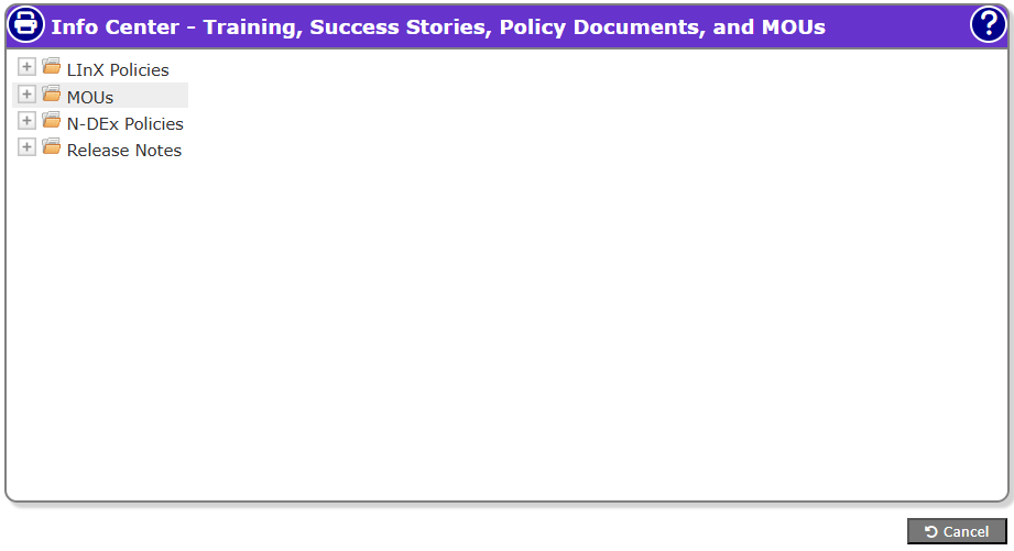 The Info Center - Training, Success Stories, Policy Documents, and MOUs area of the Info Center screen contains hyperlinks to LInX and region-specific PDFs (e.g., MOUs). PDFs can be displayed as stand-alone entries or grouped in folders. Folders will initially display as closed, with a plus sign [+] next to the folder icon. Folders can be expanded by clicking on the plus sign [+] or collapsed by clicking on the minus sign [-] next to the folder icon.