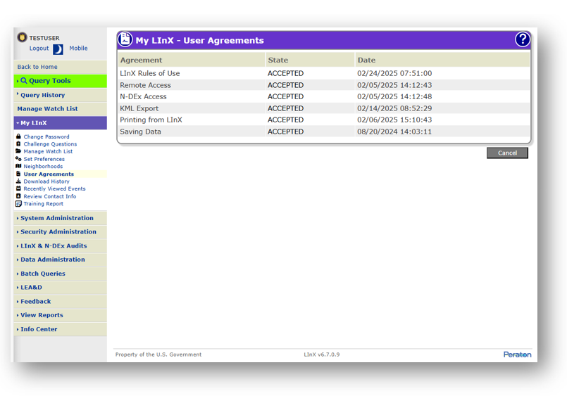 The date and time a user accepts or rejects any of the LInX User Agreements is logged and saved in LInX. The user may review any of the requisite user agreements by selecting User Agreements under My LInX. The User Agreements screen displays a list of individual agreements that require the user’s acceptance in order to utilize that segment of the LInX application. The screen also shows the state of each agreement (i.e., Accepted, requiring Review, or Rejected), and the date and time the specific agreement was accepted or rejected.
