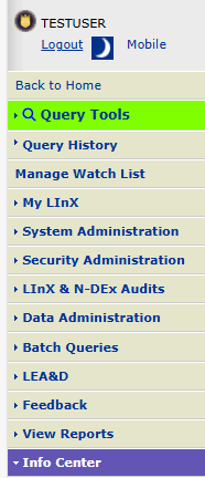 Once a user is logged in to LInX, a link to the Mobile version of the application is provided at the top left of the screen (under the Userid). The user can toggle between the mobile version and the desktop version of the application using this link and the Desktop Version link found on the Mobile query screen.